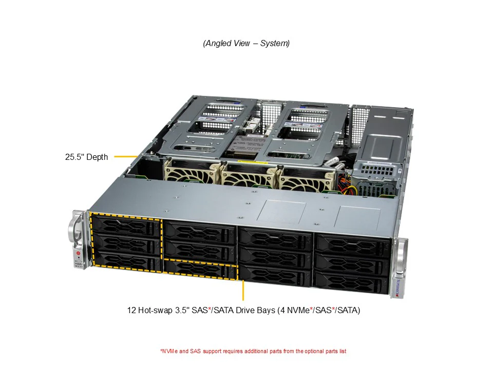 Por padrão, são 12 baias hot-swap para HDD/SSD SATA. Também é possível configurar para suportar NVMe ou SAS com peças opcionais.