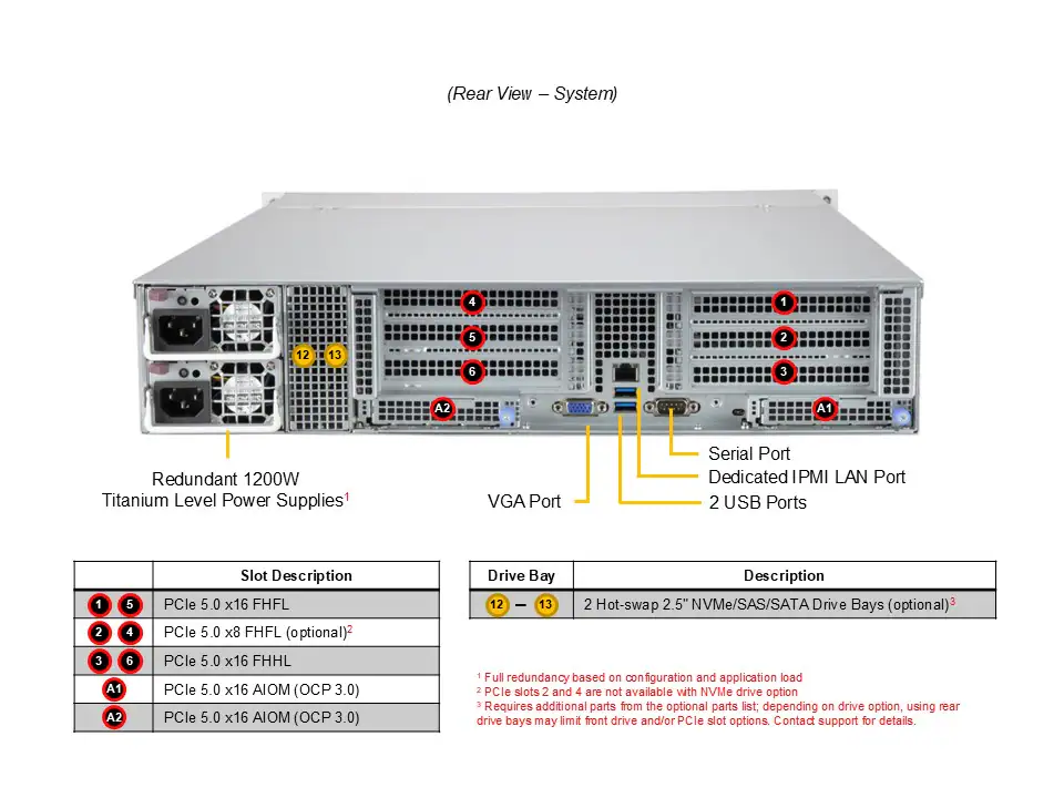 Inclui 2x PCIe 5.0 x16 FHFL, 2x PCIe 5.0 x16 FHHL e 2x PCIe 5.0 x8 (opcional), além de 2 AIOM (OCP 3.0).