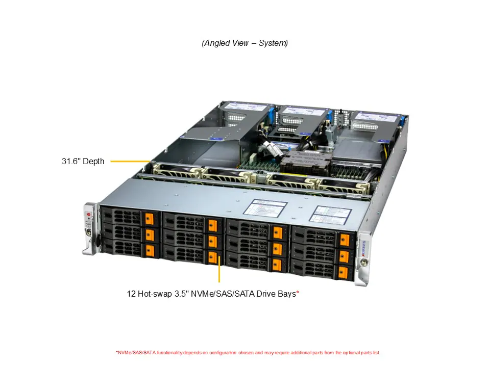 12 baias hot-swap frontais compatíveis com NVMe/SATA/SAS (3,5″/2,5″)
