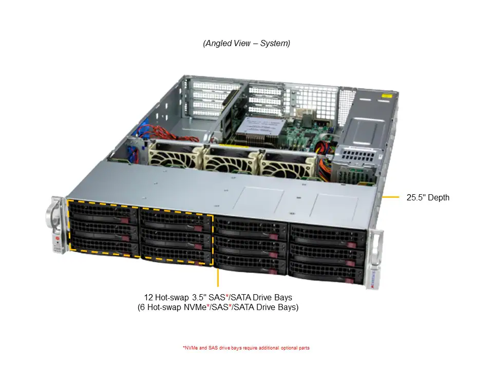 12 baias hot-swap 3,5″/2,5″, com suporte para SATA, SAS e NVMe