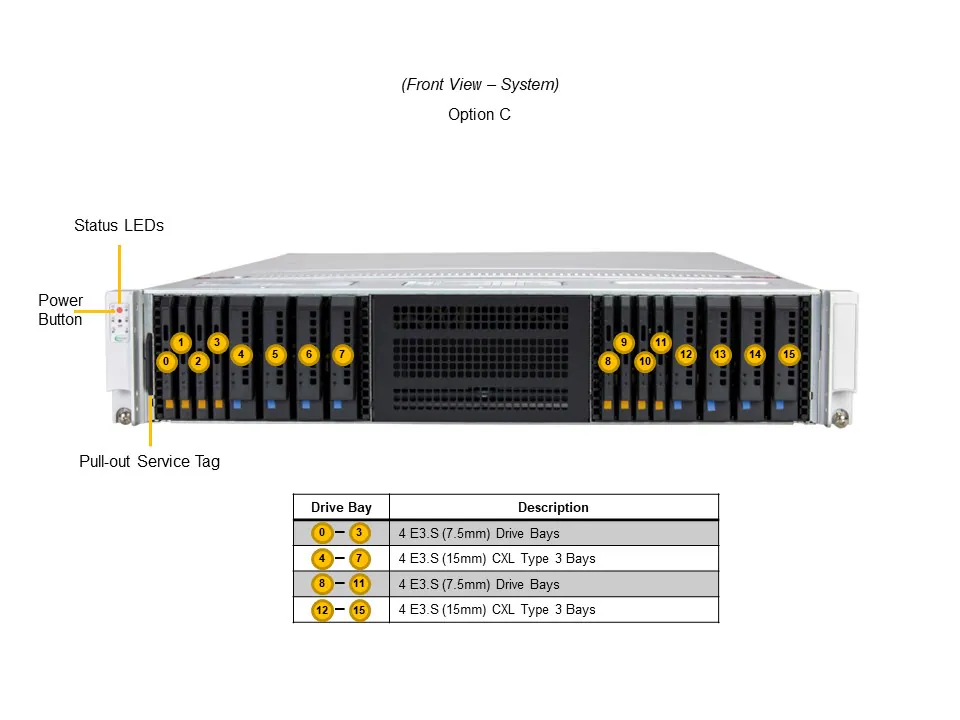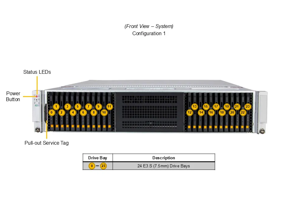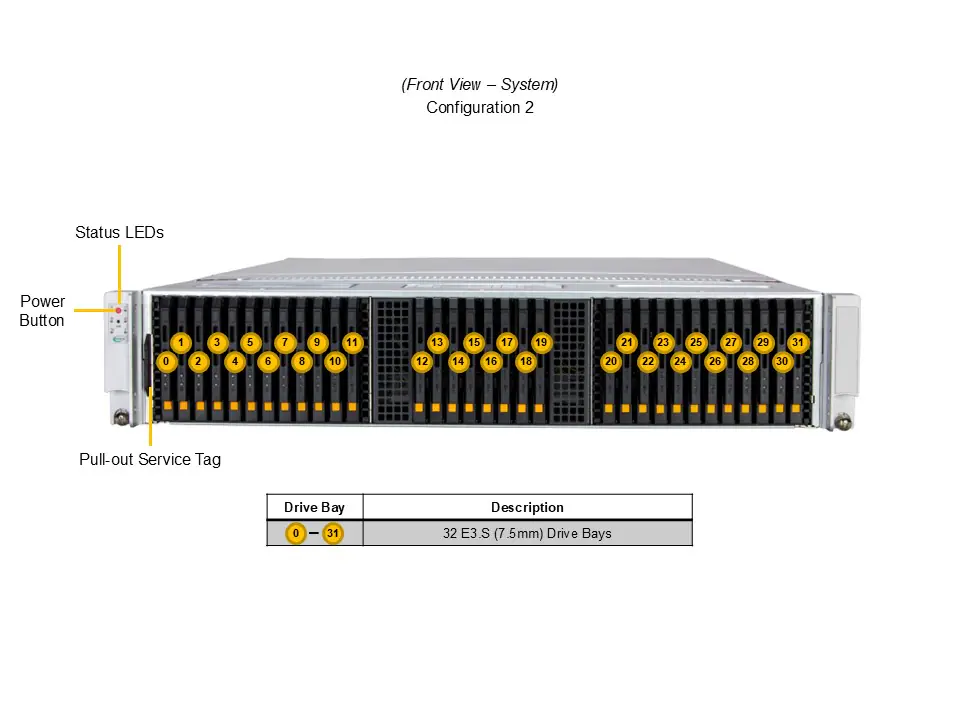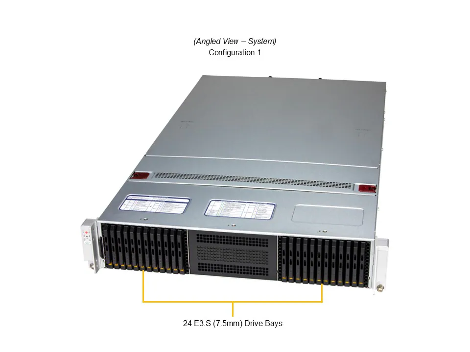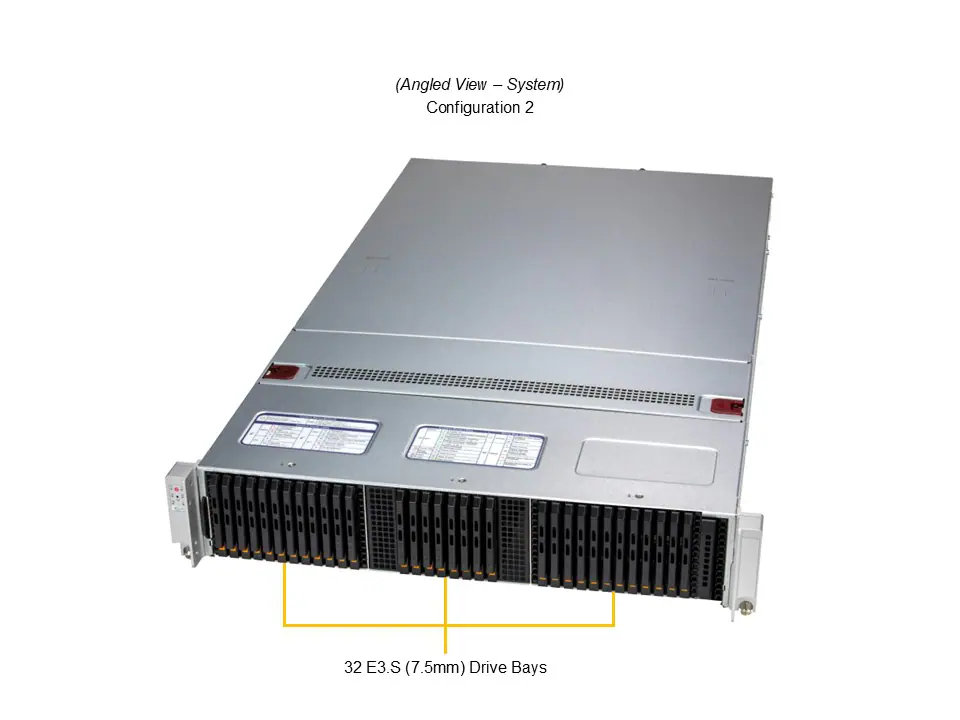 É compatível com unidades NVMe E3.S PCIe 5.0, com opções hot-swap para até 32 baias frontais.