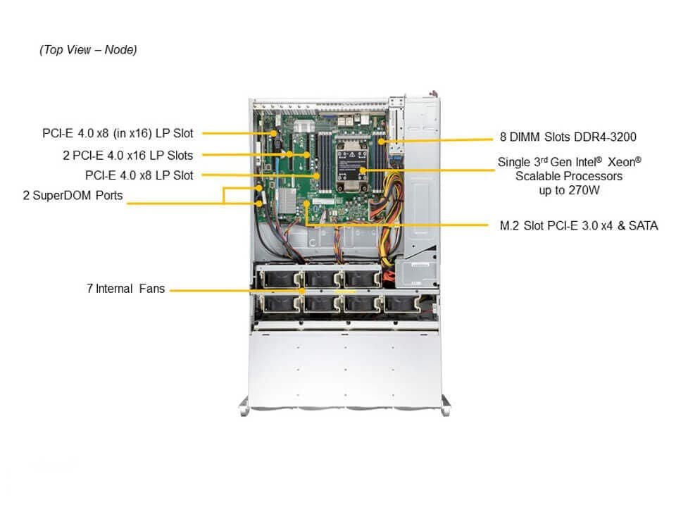 Ele oferece 36 baias SAS/SATA de 3,5″ hot-swap, suporte a processadores Xeon Scalable de até 270W e conectividade 10GbE, com capacidade de expansão via PCIe 4.0.
