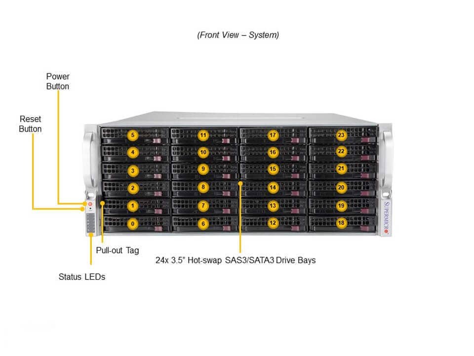 • 36 baias SAS3/SATA3 3,5″ hot-swap (24 frontais + 12 traseiras)