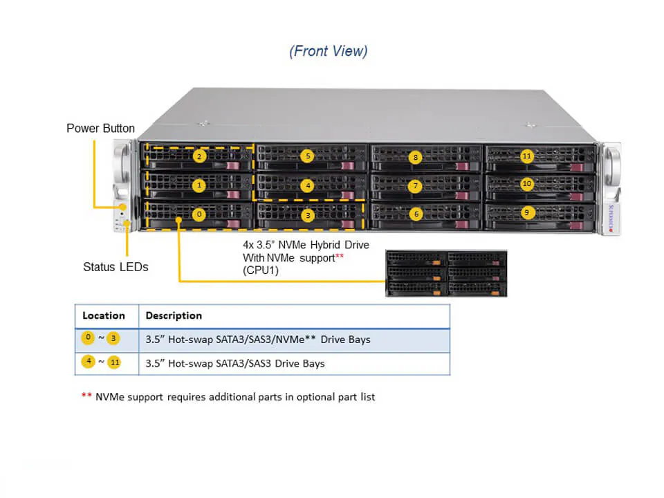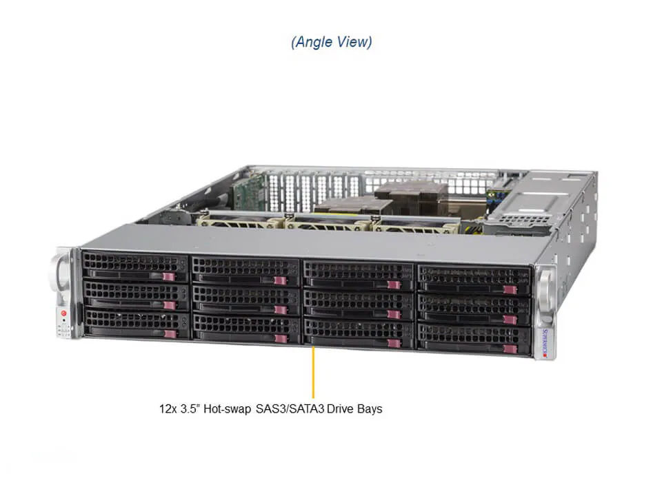 É um servidor de armazenamento 2U com 12 baias SAS/SATA/NVMe hot-swap, ideal para aplicações empresariais, virtualização e data centers.