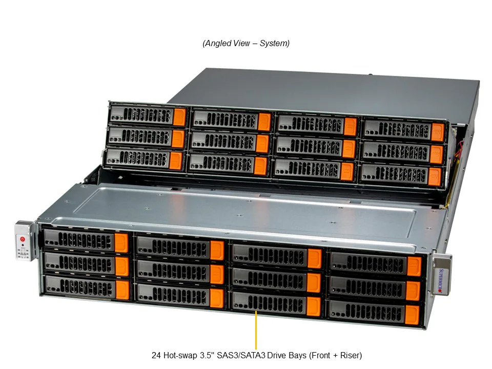 24 baias de 3,5″ SAS/SATA hot-swap (12 frontais e 12 superiores)