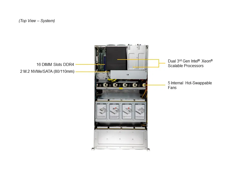 O servidor é compatível com processadores Intel® Xeon® Scalable de 3ª geração, com até 38 núcleos por CPU.