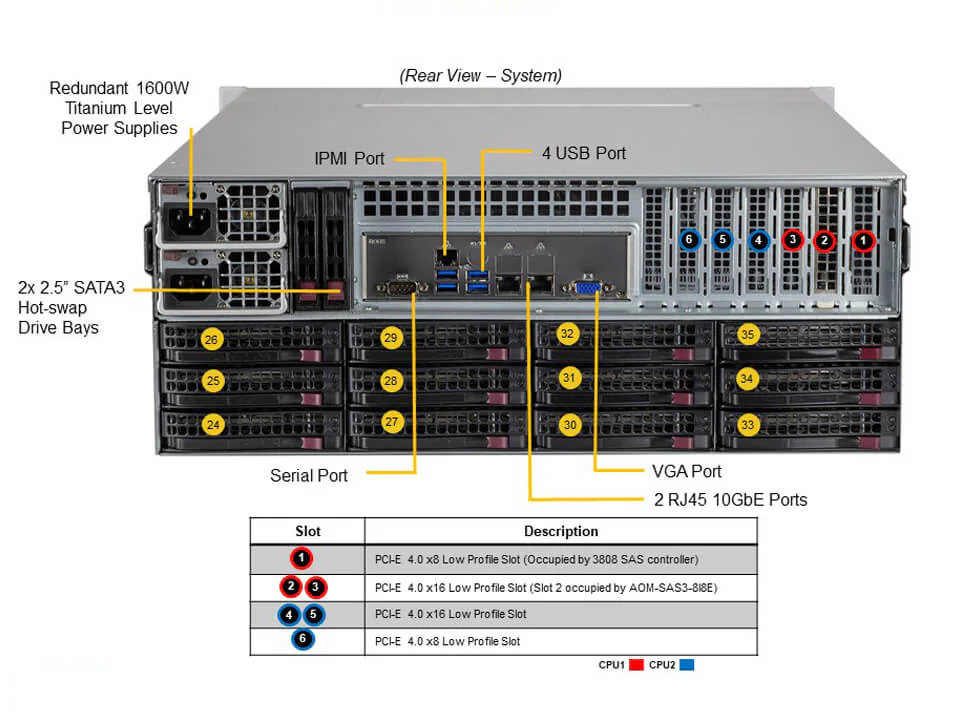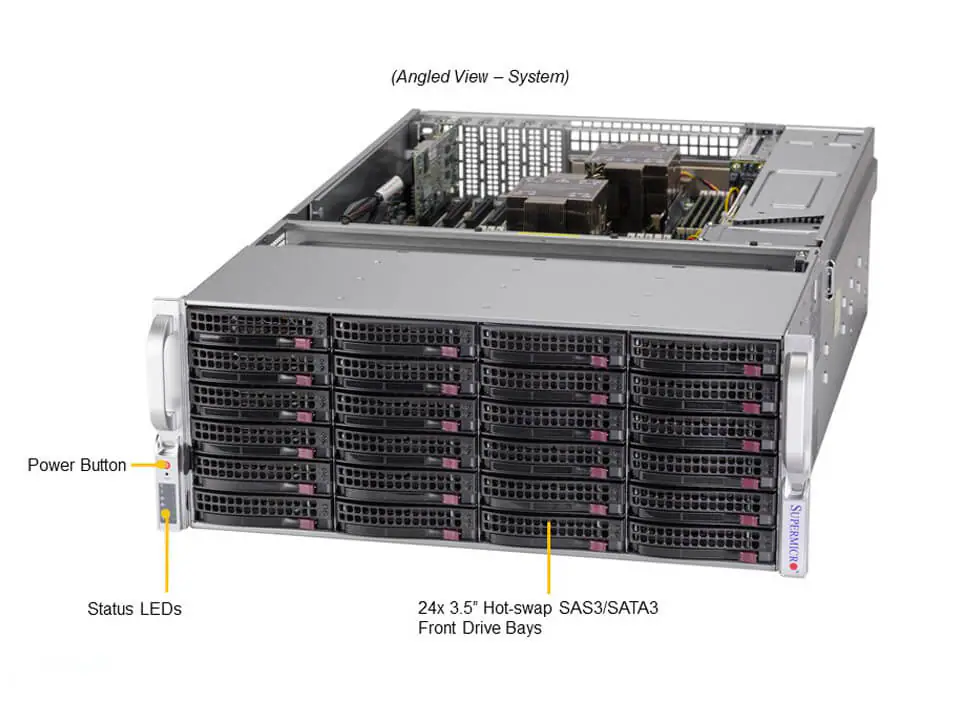 Servidor 4U da Supermicro com 36 baias hot-swap SAS/SATA, Dual Xeon de até 76 núcleos, PCIe 4.0, rede 10GbE e fontes redundantes de 1600W.