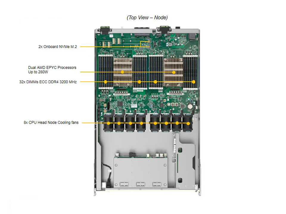Suporta processadores AMD EPYC das séries 7002 e 7003, com até 280W de TDP.