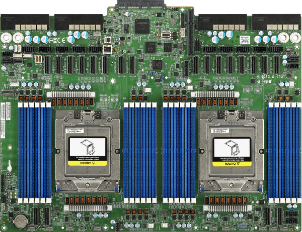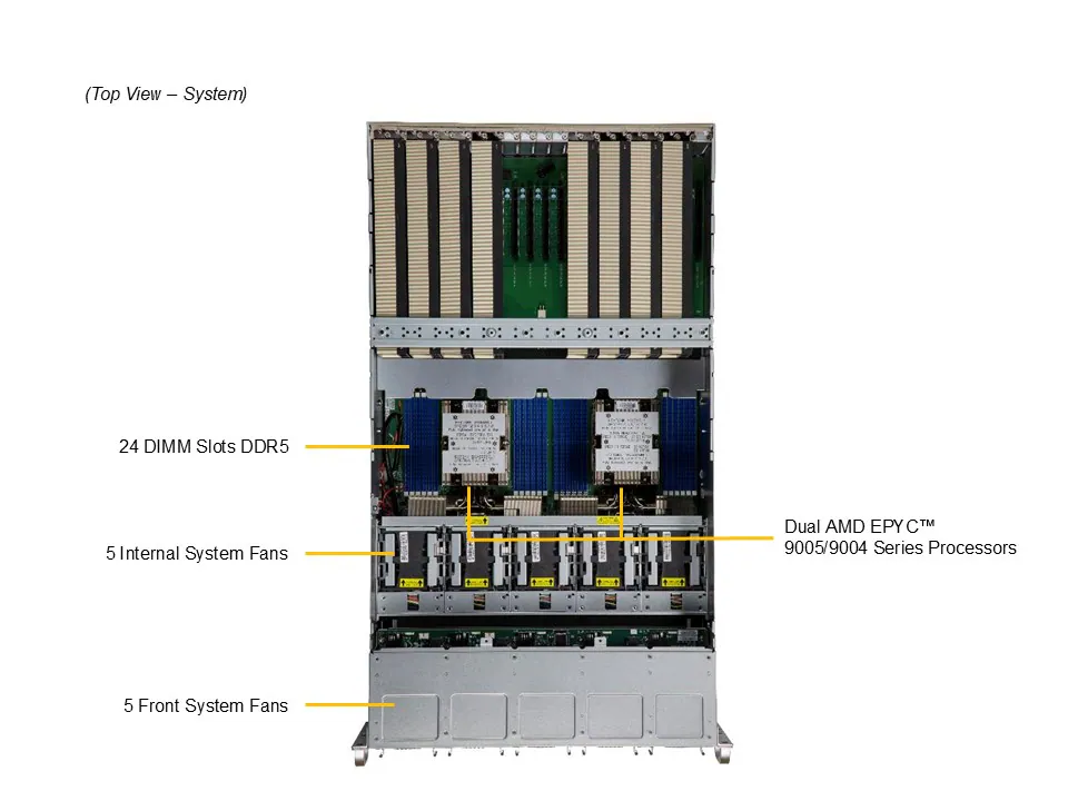 O principal diferencial é o suporte para até 8 GPUs PCIe 5.0, processadores AMD EPYC com até 192 núcleos, memória DDR5 até 6TB e fontes redundantes com certificação Titanium.