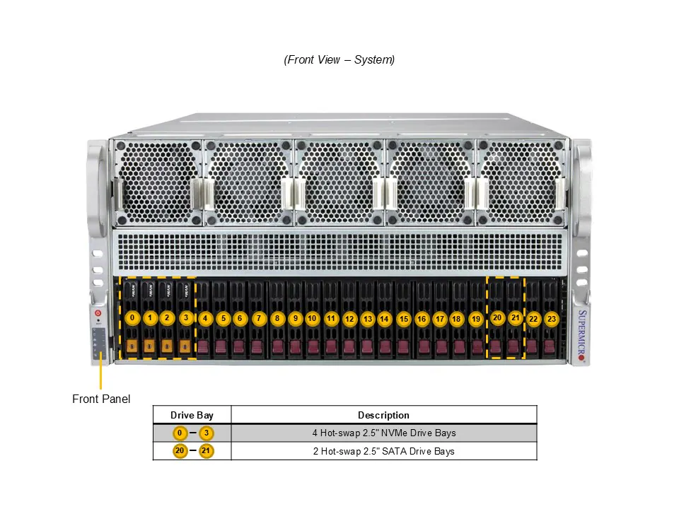 Você pode instalar até 6 unidades hot-swap frontais (2 SATA + 4 NVMe), além de um SSD M.2 interno.