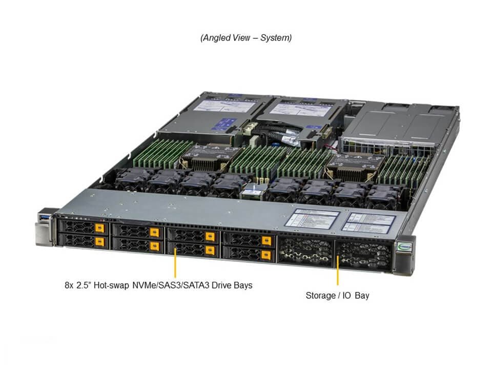 O diferencial está na combinação de alto desempenho (até 8 TB de RAM e 2 CPUs Xeon), suporte a GPUs e até 8 baias NVMe, tudo em um chassi compacto.