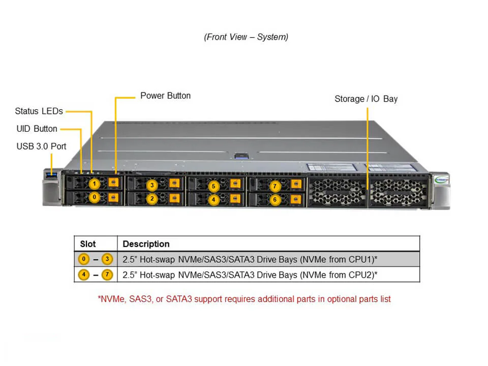8 baias hot-swap NVMe/SATA/SAS de 2,5″
