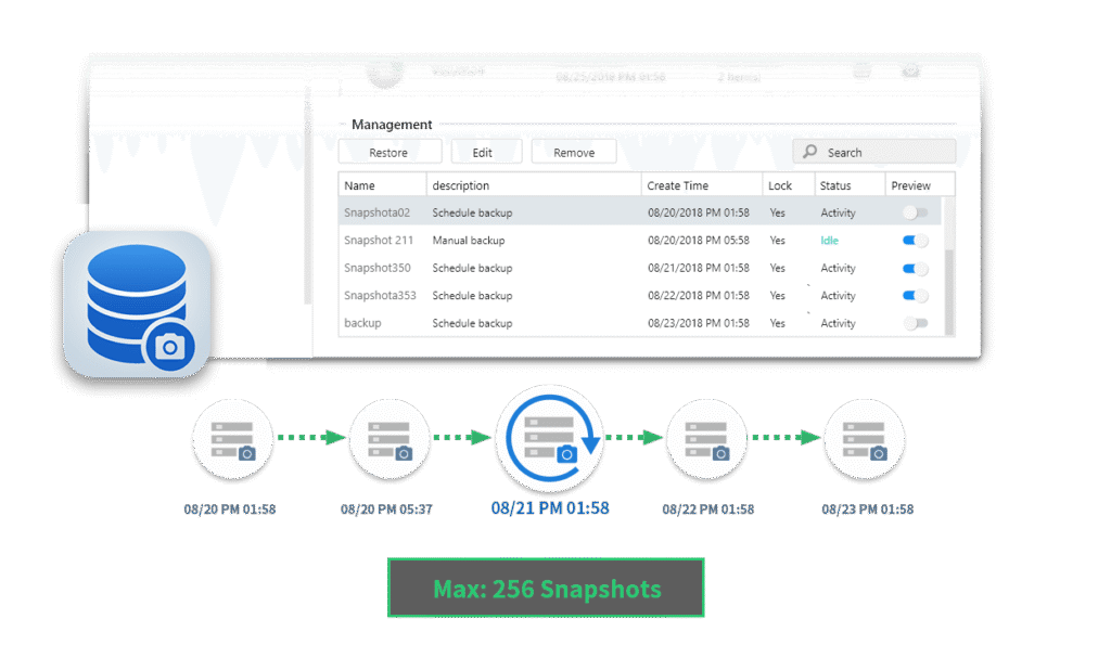 O sistema operacional ADM baseado em Linux incorpora firewall, antivírus ClamAV, criptografia AES-256 e suporte a snapshots Btrfs. Em cenários de ataque de ransomware, a função Snapshot Center permite restaurar rapidamente versões anteriores de dados, reduzindo riscos de indisponibilidade.
