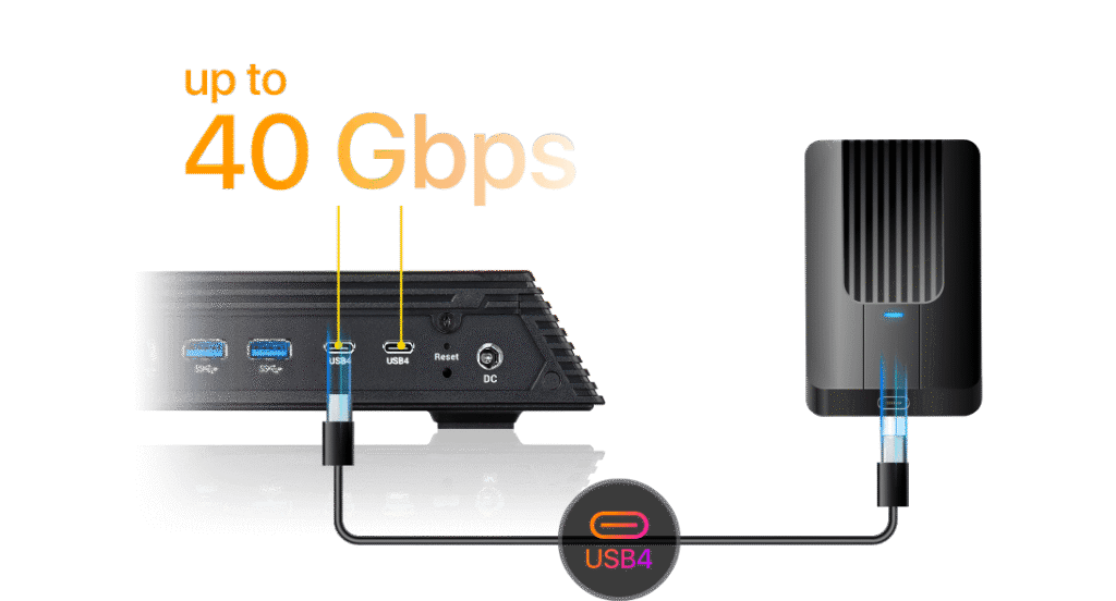 A integração de portas USB4 adiciona outra camada de flexibilidade estratégica. Com até 40 Gbps de largura de banda, profissionais podem conectar storages externos, dispositivos Thunderbolt 3/4 ou fluxos temporários de ingestão de conteúdo sem comprometer a performance interna do NAS. É importante notar que CPUs Ryzen Embedded V3000 não suportam conexões host-to-host via USB4, porém o suporte para storage externo permanece funcional e extremamente valioso para pipelines dinâmicos.
