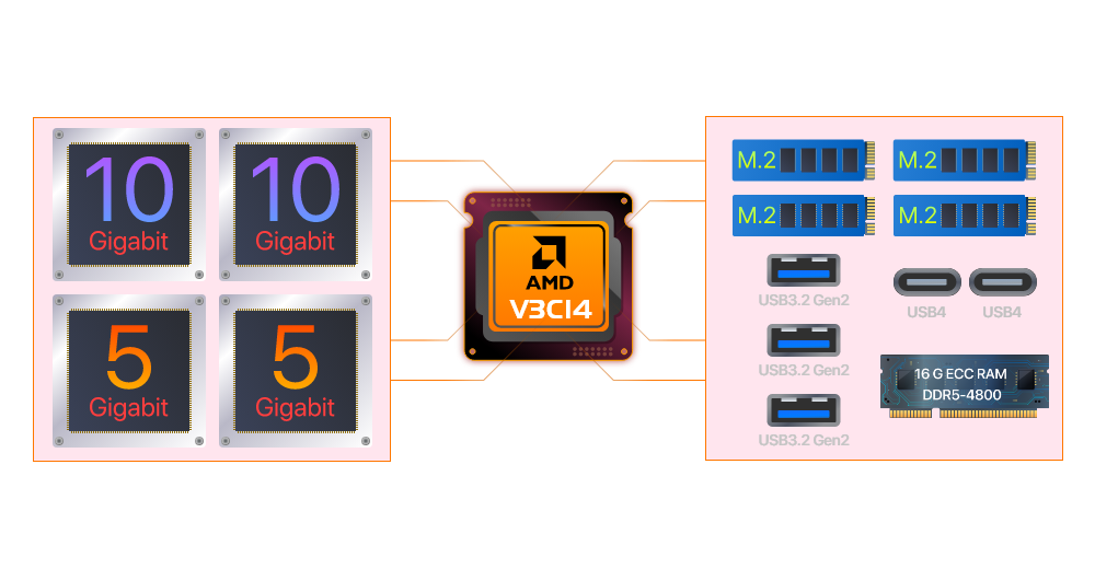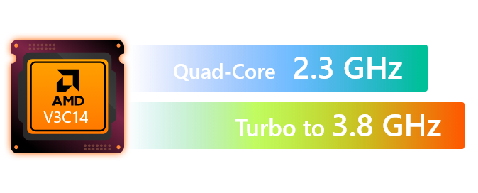 No núcleo do LOCKERSTOR 8 Gen3 está o AMD Ryzen V3C14 Embedded, um SoC de quatro núcleos com frequências que vão de 2,3 GHz a 3,8 GHz em Turbo. Essa arquitetura oferece eficiência energética ao mesmo tempo em que garante desempenho comparável a desktops, o que se traduz em capacidade para lidar com múltiplos fluxos de trabalho simultaneamente.