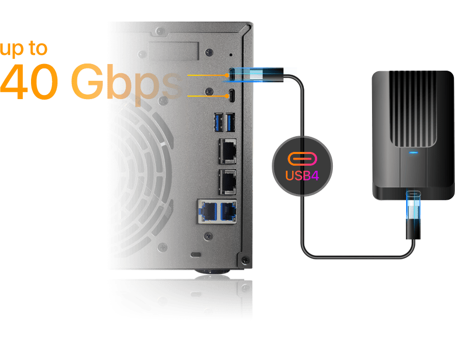 A conectividade é outro eixo fundamental. O LOCKERSTOR 8 Gen3 traz duas portas USB4 de 40 Gbps, capazes de integrar dispositivos Thunderbolt 3/4 e soluções externas de armazenamento em velocidades inéditas no segmento. Além disso, conta com duas portas Ethernet 10GbE e duas 5GbE, permitindo balanceamento de carga, failover e cenários de alto throughput.