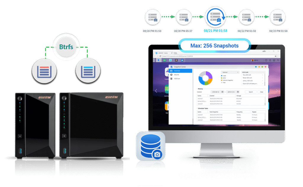 O Drivestor 2 Lite é o primeiro NAS ARM da ASUSTOR a oferecer suporte ao sistema de arquivos Btrfs, conhecido por sua capacidade de criar snapshots praticamente instantâneos e leves. Essa funcionalidade é implementada por meio do Snapshot Center, que permite a automação e controle granular da proteção de dados.