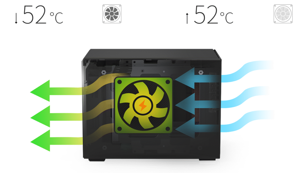 A ventoinha de 120 mm integrada ajusta automaticamente sua velocidade de acordo com a temperatura dos discos, equilibrando ruído e performance térmica. Esse controle inteligente evita falhas por superaquecimento e reduz custos com manutenção preventiva.
