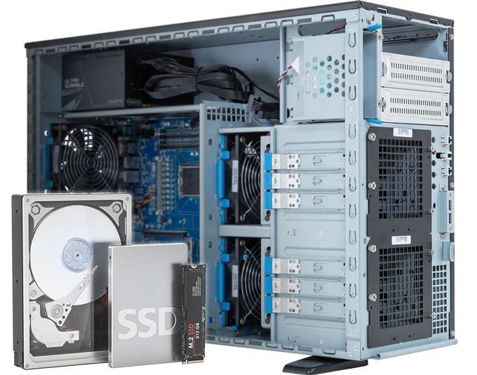 Complementando a infraestrutura, a presença de até 8 baias SATA 3.5″/2.5″ assegura a combinação entre armazenamento quente (hot data) em NVMe e armazenamento frio (cold data) em SATA, permitindo uma arquitetura de dados hierarquizada e eficiente para diferentes tipos de workload.