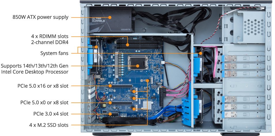 O suporte aos processadores Intel® Core™ de 14ª, 13ª e 12ª geração proporciona uma base flexível que equilibra desempenho e eficiência energética. A arquitetura híbrida introduz núcleos de performance e eficiência (P-cores e E-cores), coordenados pelo Intel Thread Director, que otimiza a distribuição das cargas de trabalho em tempo real. Isso permite que a workstation atinja máxima produtividade em tarefas paralelas, ao mesmo tempo em que preserva o consumo energético sob cargas leves.