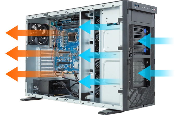 Esse projeto reduz o acúmulo de calor interno e maximiza a eficiência dos ventiladores modulares GIGABYTE, ajustados dinamicamente via GSM Smart FAN Speed Control.