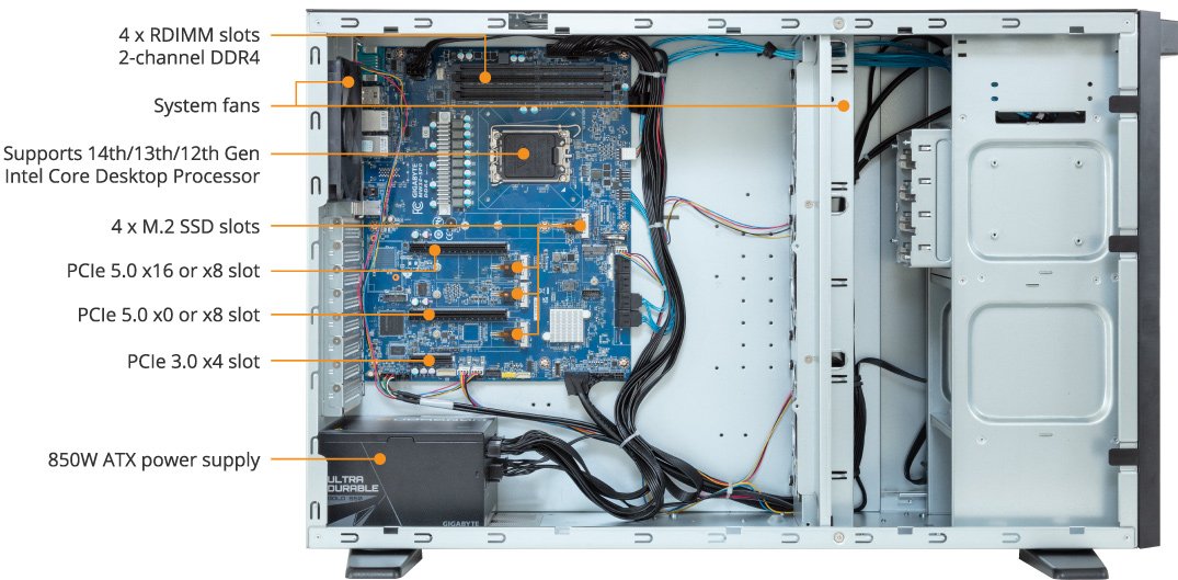 Com 2 slots PCIe Gen5 (x16 e x8) e 1 slot PCIe Gen3 x4, a workstation permite integrar GPUs de última geração, como NVIDIA RTX A6000, Radeon PRO W7900 e GeForce RTX 4080.