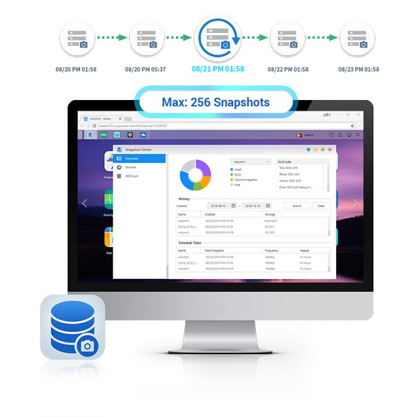 O equipamento inclui centros dedicados para backup e sincronização: Snapshot Center, Cloud Backup Center e DataSync Center. Na prática, isso permite integrar nuvens como Amazon S3, Azure, Backblaze B2 e Dropbox, criando um ecossistema híbrido em que os dados ficam disponíveis localmente e remotamente. O uso do sistema de arquivos Btrfs habilita até 256 snapshots por volume, fortalecendo a resiliência contra falhas ou exclusões acidentais.