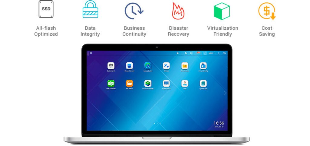O ES1686dc suporta VMware vSphere 6.5, Windows Server 2016 e Citrix XenServer 7.0, além de VAAI e ODX para descarregar operações. Plug-ins de gerenciamento, como QNAP vSphere Client e provedor SMI-S, simplificam operações. Com Mellanox Smart NICs e iSER, há ganhos sobre a eficiência de virtualização VMware.