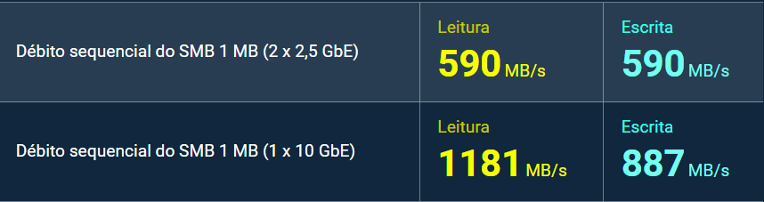 Nos testes realizados pela QNAP, utilizando SSDs Samsung 860 PRO em RAID 5 e conectividade 10GbE, foi possível alcançar altas taxas de leitura e escrita sequenciais.