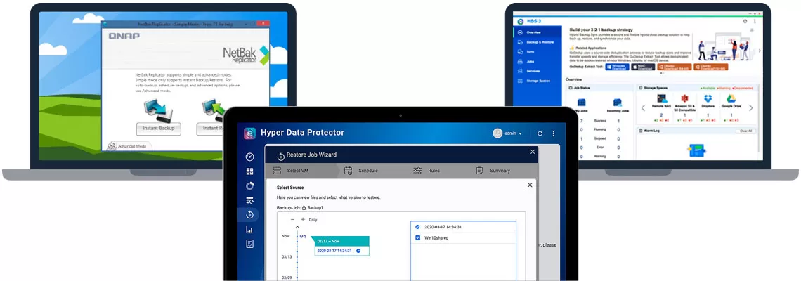 O HBS (Hybrid Backup Sync), por exemplo, permite backups incrementais, deduplicação, sincronização com nuvens públicas (Amazon, Azure, Google Cloud) e restauração granular. Já o Hyper Data Protector garante a proteção de ambientes virtuais VMware e Hyper-V sem agentes.